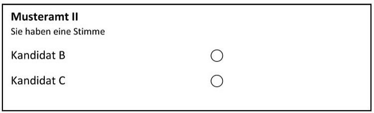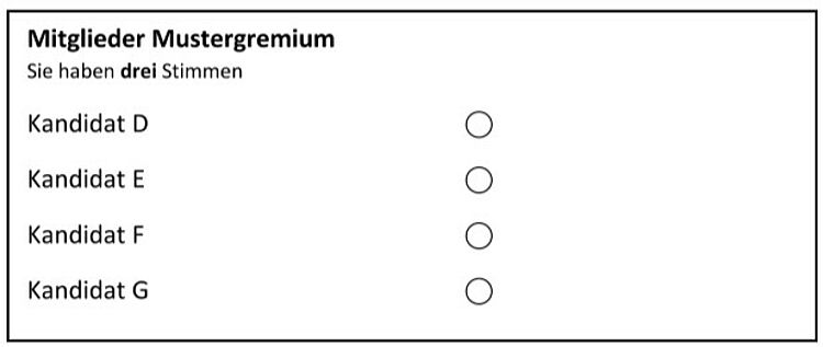 Auch in diesem Fall hat das wahlberechtigte Mitglied eine Stimme, muss sich aber aktiv für einen der vorgeschlagenen Kandidaten entscheiden. Eines der Auswahlfelder ist anzukreuzen oder anderweitig kenntlich zu machen.