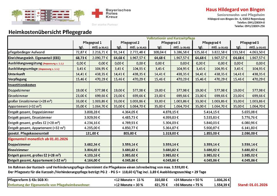 Auf dieser Seite wird dargestellt, welche Kosten für die Unterbringung im Haus Hildegard-von-Bingen Regensburg anfallen. Diese Kosten sind mit den öffentlichen Kostenträgern (Pflegekassen und Sozialhilfeträger) abgestimmt.